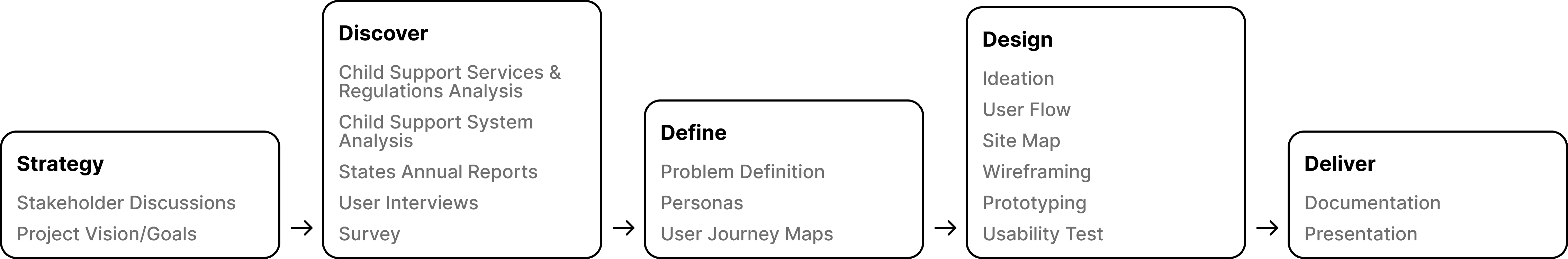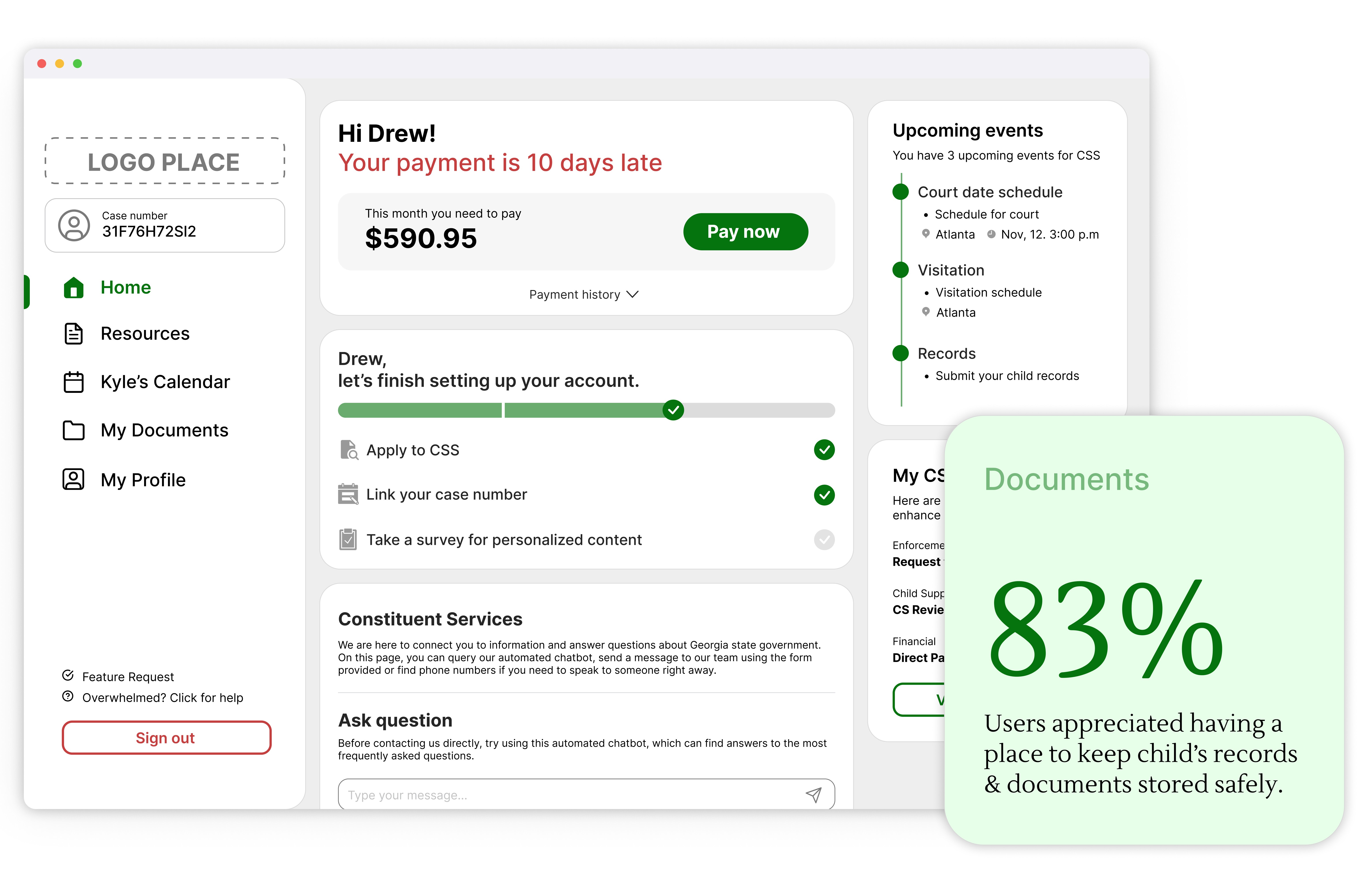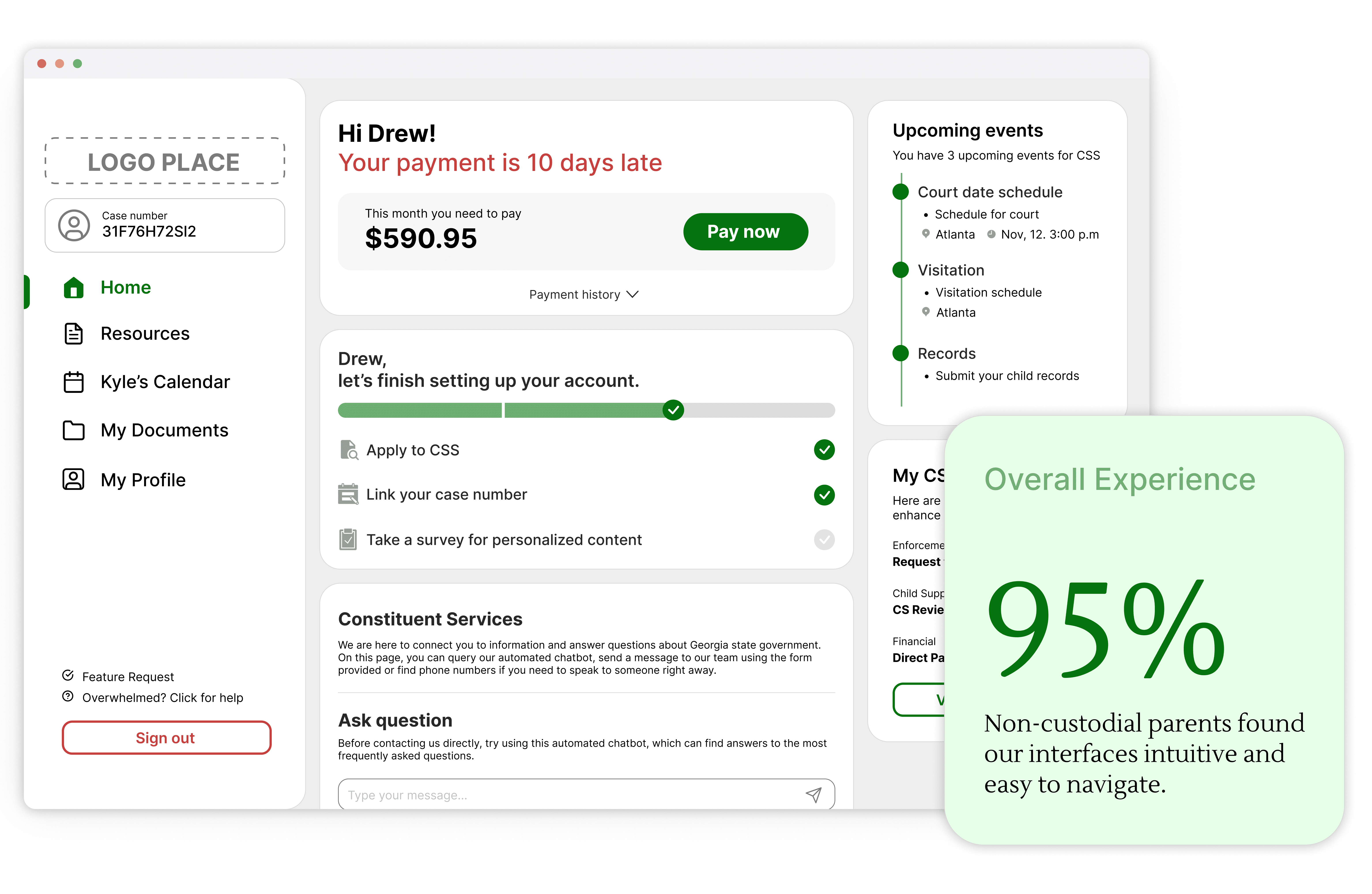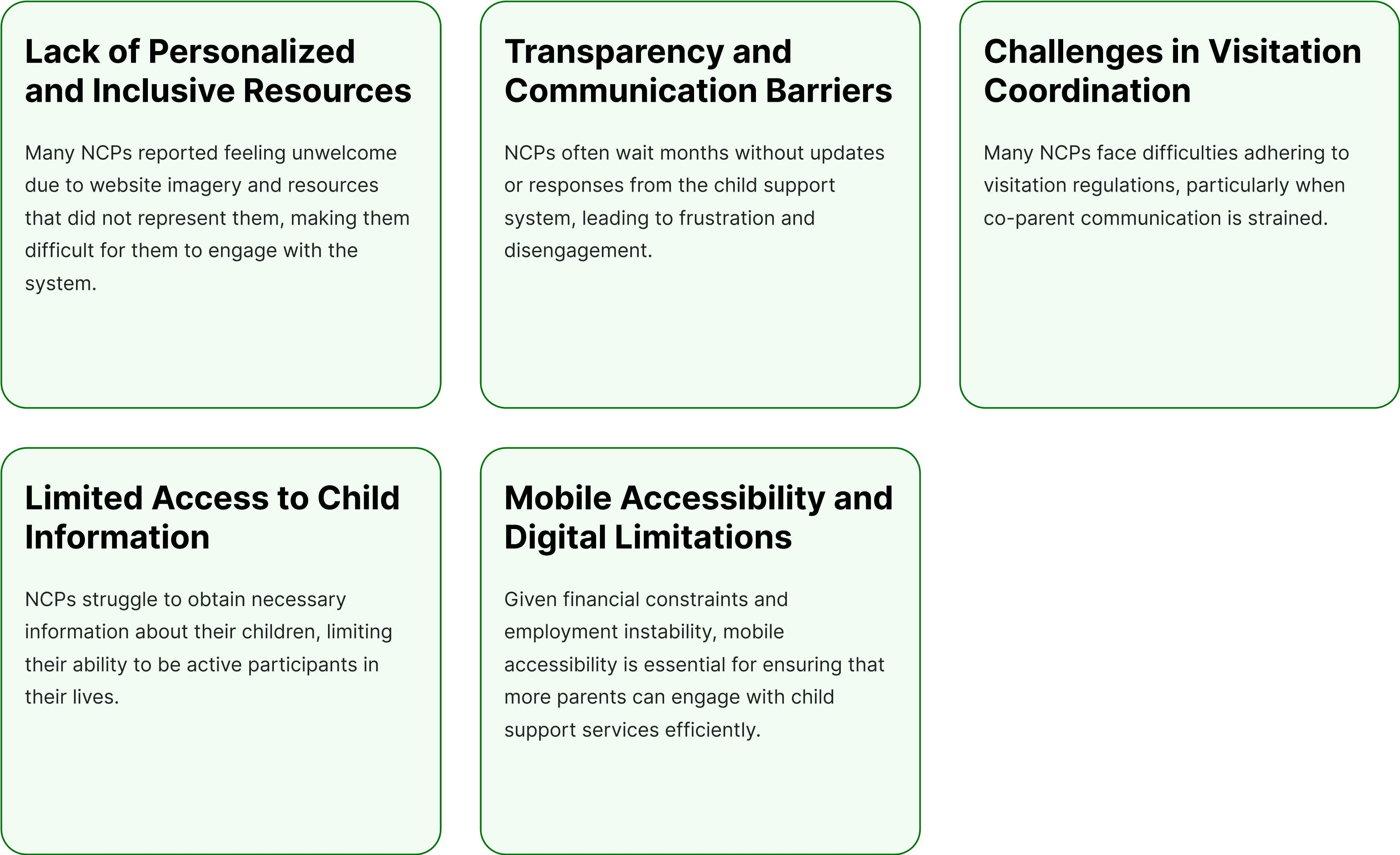 Each year, over 13.6 million U.S. parents rely on child support services, yet 40% of non-custodial parents struggle with fragmented information and complex processes. Beyond financial obligations, many face legal hurdles and co-parenting conflicts, often worsened by strained relationships. The lack of clear guidance leads to frustration, miscommunication, and compliance issues. Our goal was to create a scalable solution that simplifies processes and fosters co-parenting collaboration.