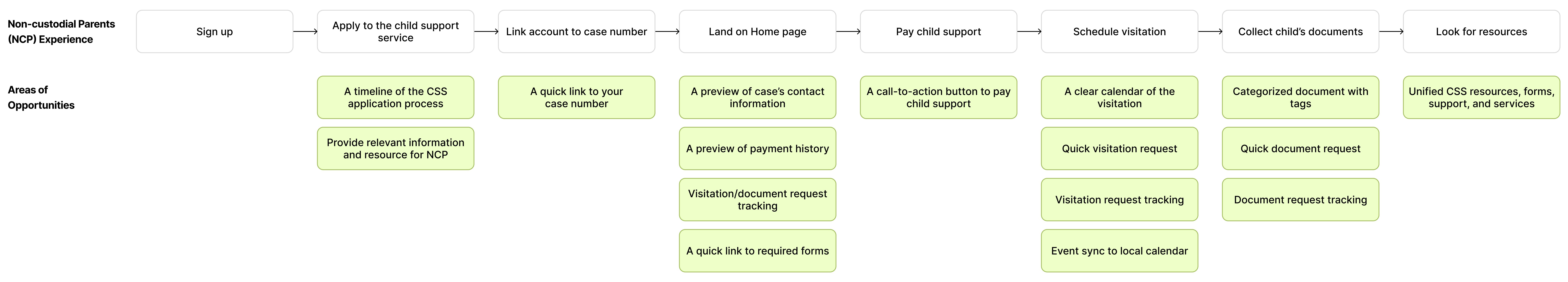 Koyu and her team mapped out the whole journey of child support services involvement and discovered the areas of opportunities. NCP needs a personalized and flexible support system that provides relevant resources, guidance, and communication tools based on their circumstances.