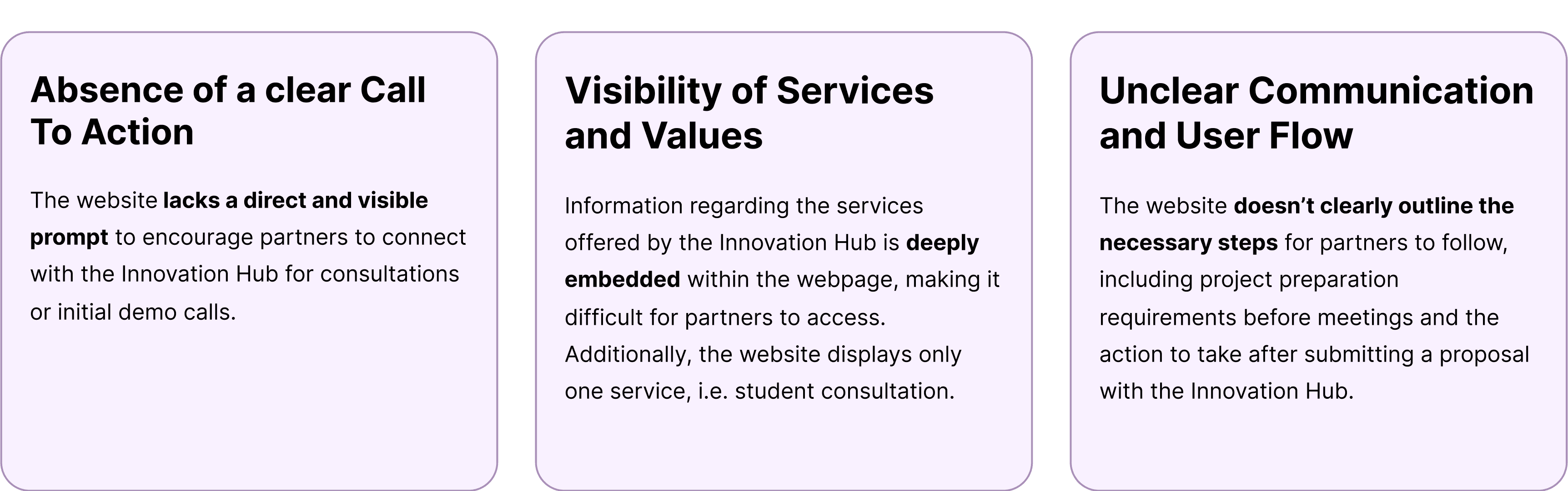 The Innovation Hub’s website faces unclear navigation, missing call-to-action flow, and ineffective communication that make it difficult for users to complete essential tasks, leading to frustration, lower engagement, and missed collaboration opportunities, ultimately impacting the Hub’s ability to secure funding and support its mission.