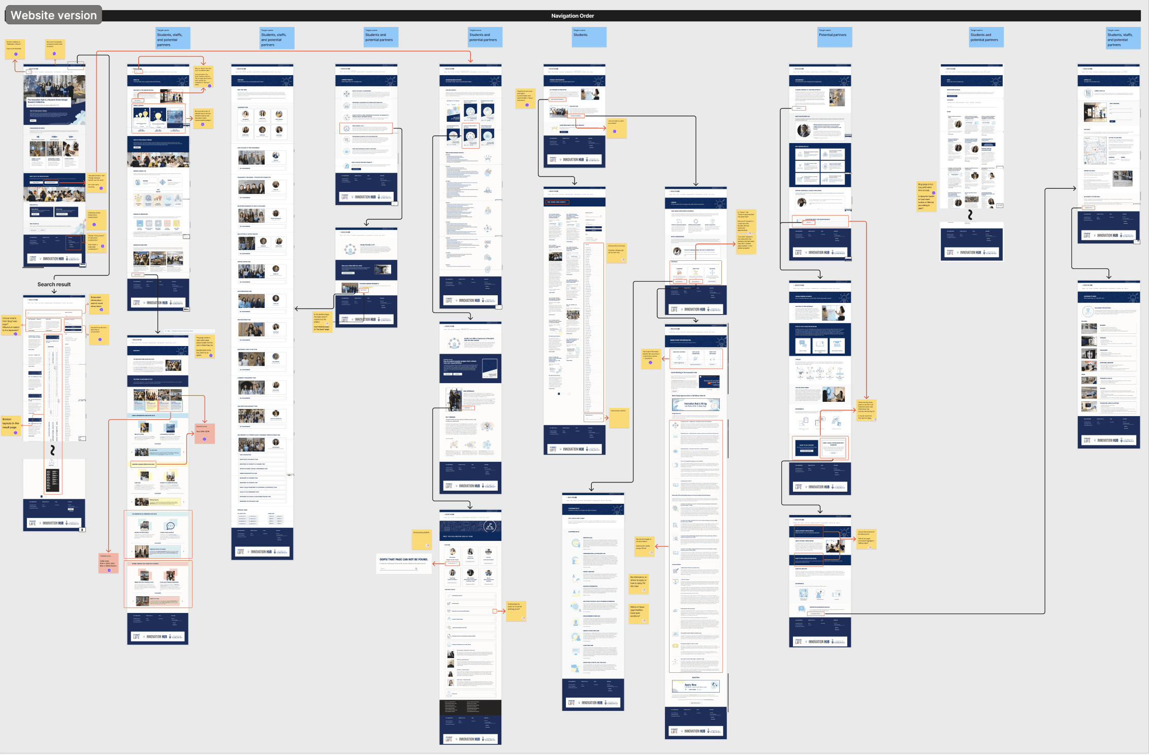 Since this is the first test, we conducted a heuristic evaluation with Jakob Nielsen’s Evaluation Guidelines to have an understanding of the problems throughout the website. Once the severe issues were spotted, Koyu and Ashfaaq defined 3 main user flows that covered students and potential partners, they then developed the test plan and invited several students and potential partners to participate in the usability evaluation.